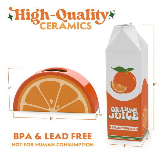 Lenor Decor Orange Juice Vase, 2 Vase Set. Ceramic Carton Vase and Sliced Orange Vase. Unique Vases for Flowers. Funky Home Decor. Colorful Vintage Retro Weird Eclectic Groovy Cool Kawaii Room Decor